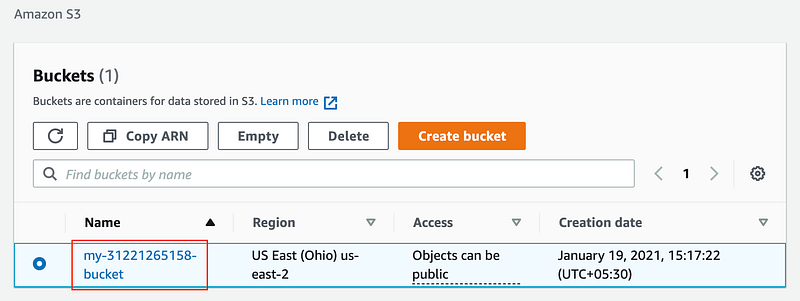 - From the S3 dashboard, click on the name of the bucket you have created in the first step above.