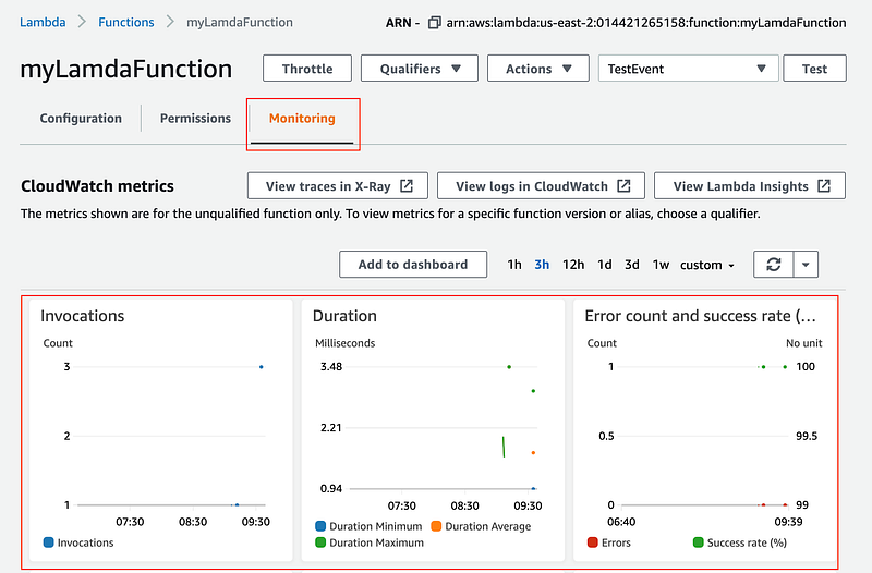 - The detailed graph in the CloudWatch console shows that the Lambda function was triggered thrice. See the snapshot below.